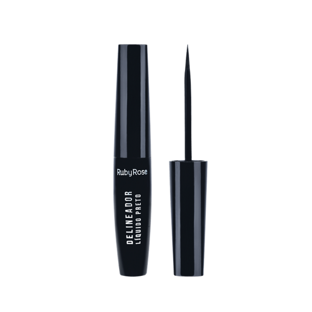 Delineador Líquido Preto Ruby Rose - ponta fina para traços precisos ou olho gatinho. Pigmentação intensa, secagem rápida e resistente à água. Produto cruelty free e vegano.