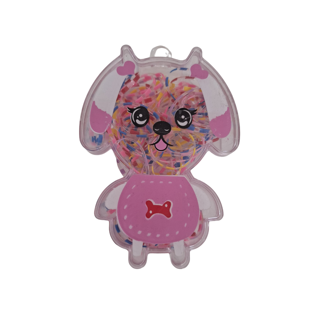 Vem em embalagem plástica fofa, em formato de cachorrinho, que guarda os elásticos com muito mais estilo.