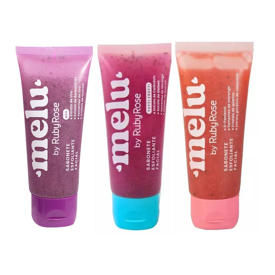 Sabonete Esfoliante Facial Melu: Limpeza impecável com esfoliação agradável que renova a pele, uniformiza manchas, minimiza poros e remove células mortas.
