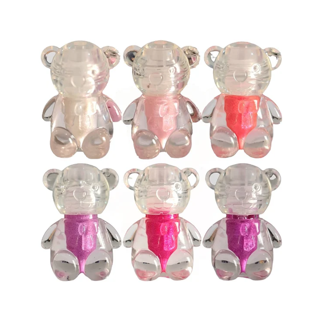 Gloss Labial infantil com textura cremosa e hidratante, acabamento brilhante com glitter e ainda vira um lindo chaveiro com formato de ursinho.