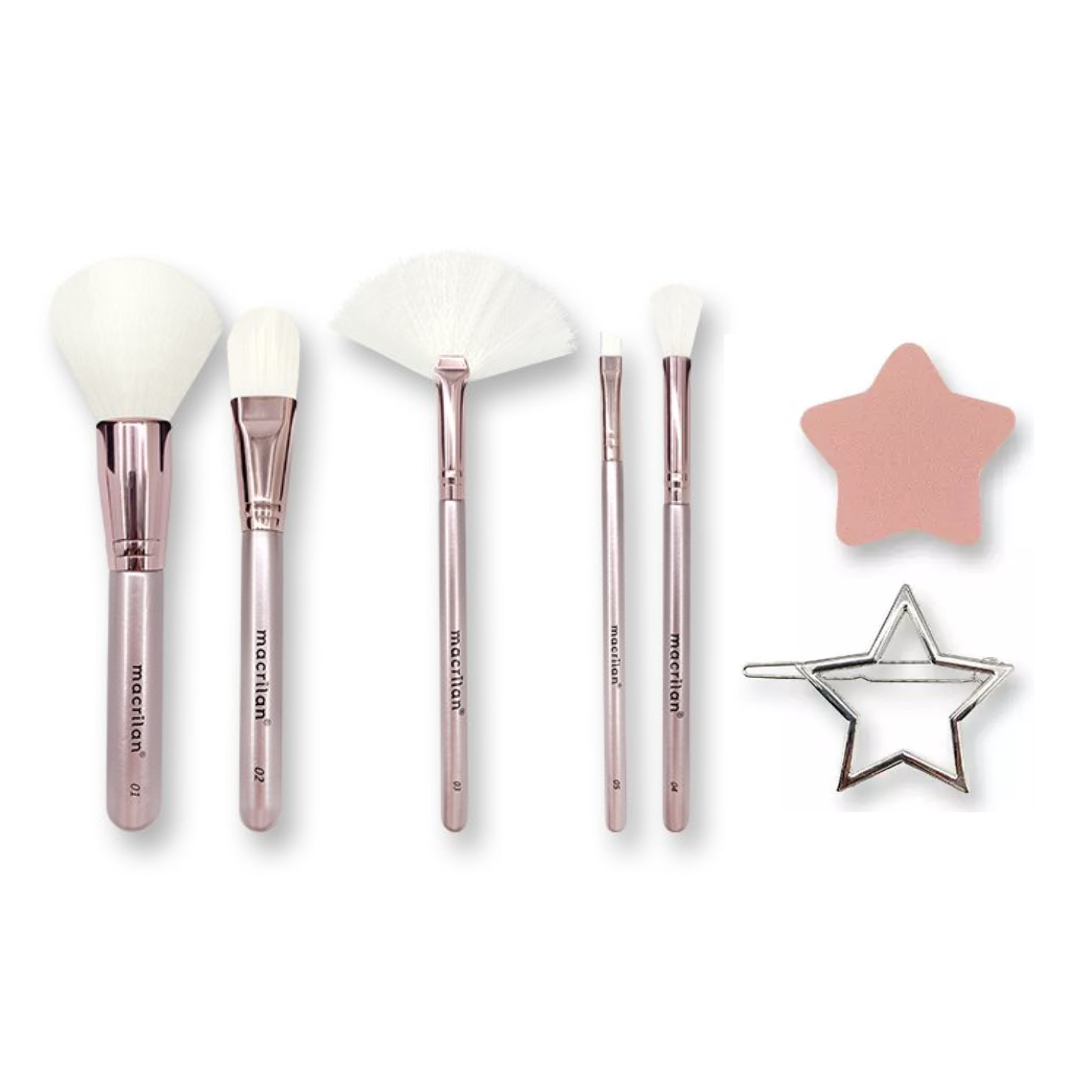 Kit Star ED011 Macrilan, especialmente desenvolvido com 05 pincéis de cerdas sintéticas, 1 presilha de cabelo e 1 esponja super macia, sem látex, em formato de estrela. Os pincéis possuem cerdas e formatos que permitem um acabamento suave e impecável, além do cabo moderno e de fácil manuseio. O Kit ideal para você brilhar em todas as ocasiões.