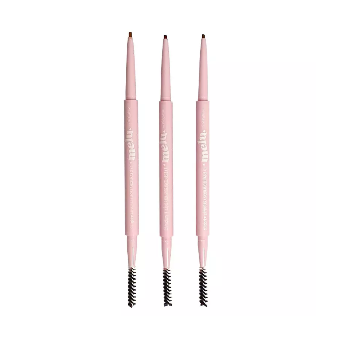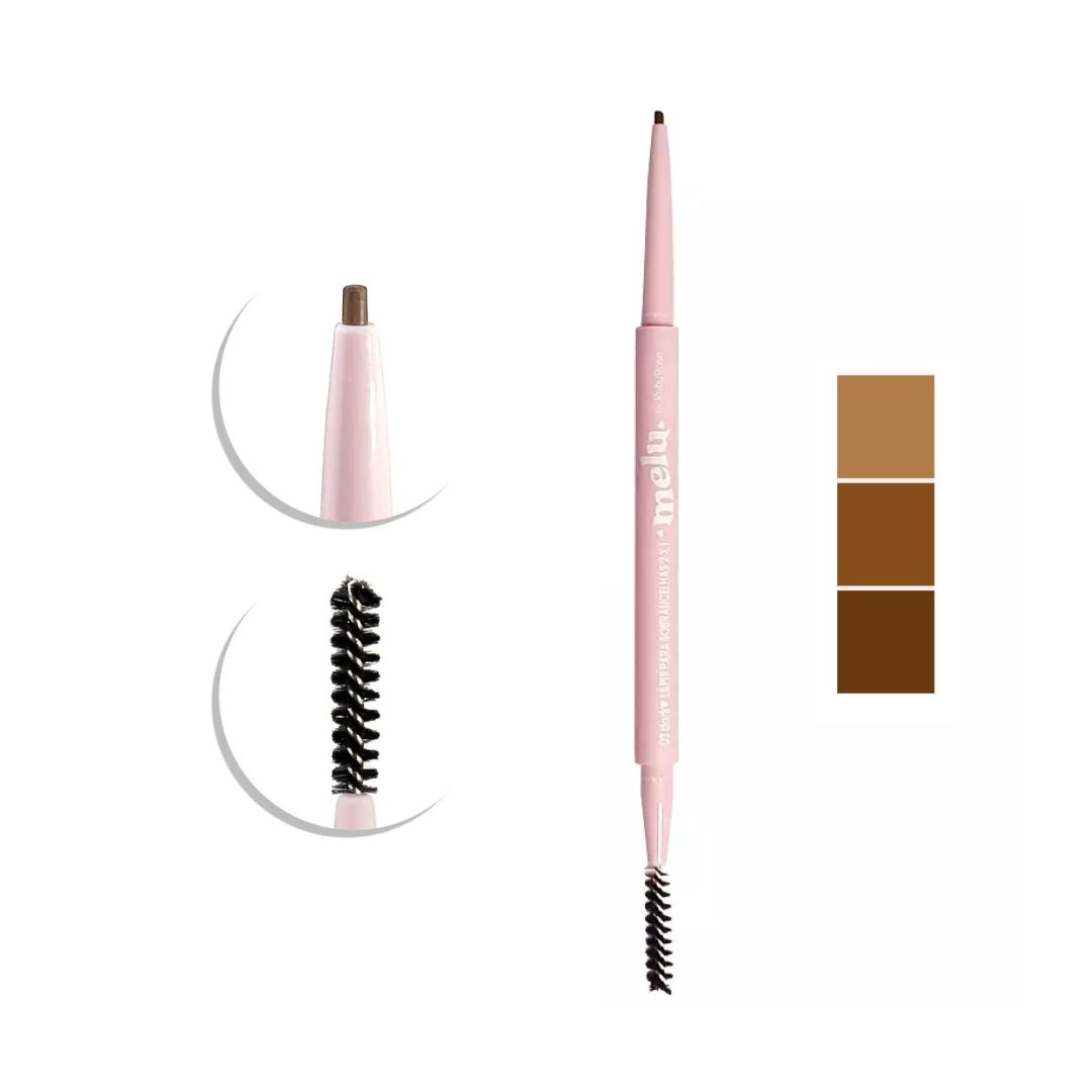 Lápis 2 em 1 Melu: lápis de sobrancelha + escova! Preenche falhas com traços precisos e esfuma para efeito natural. Fixação imediata.