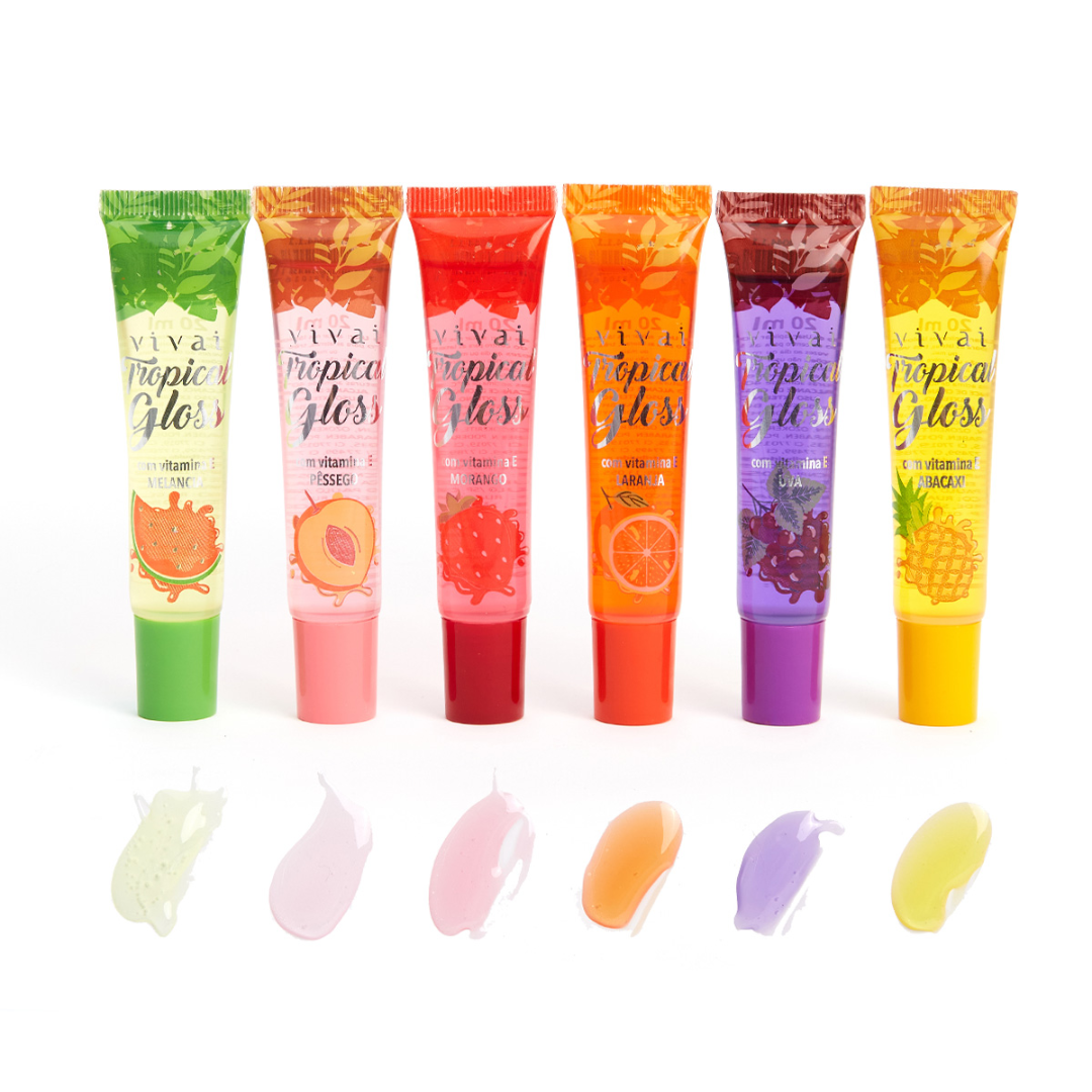 Gloss Tropical Vivai: 6 cores + aromas frutados! Brilho intenso, textura confortável e fixação incrível. Do dia a dia à balada!